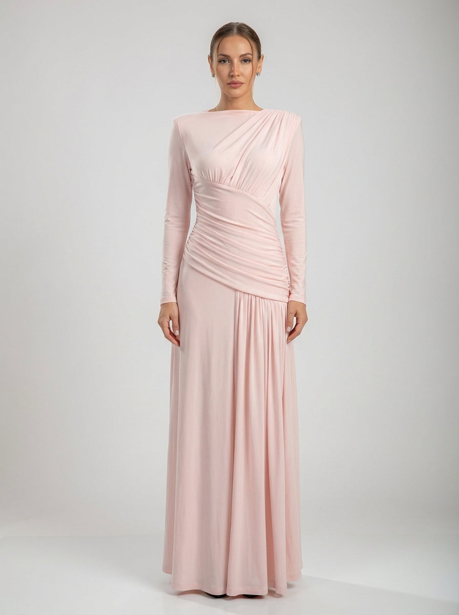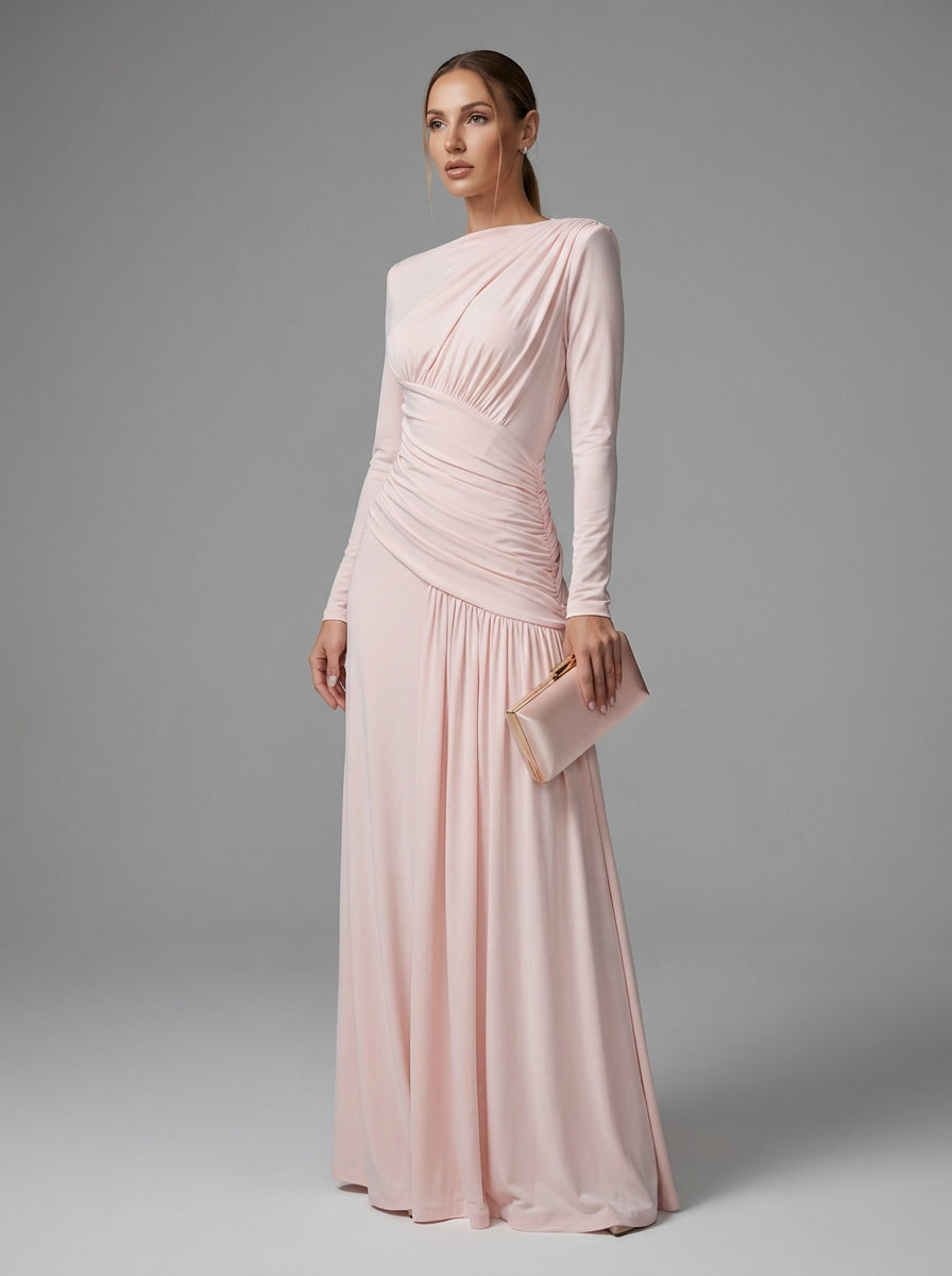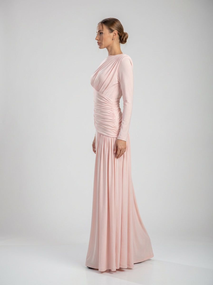 שמלת Amara Draped Blush היא שמלה ארוכת שרוולים באורך הרצפה עם נידוף רך, צווארון אסימטרי וצללית זורמת אלגנטית.