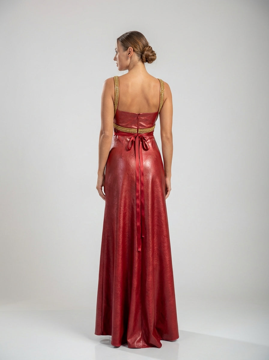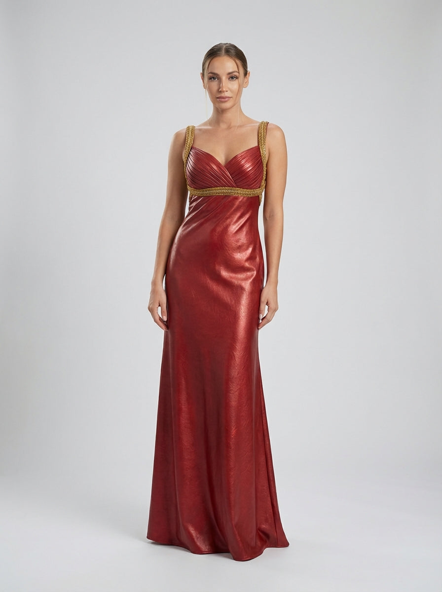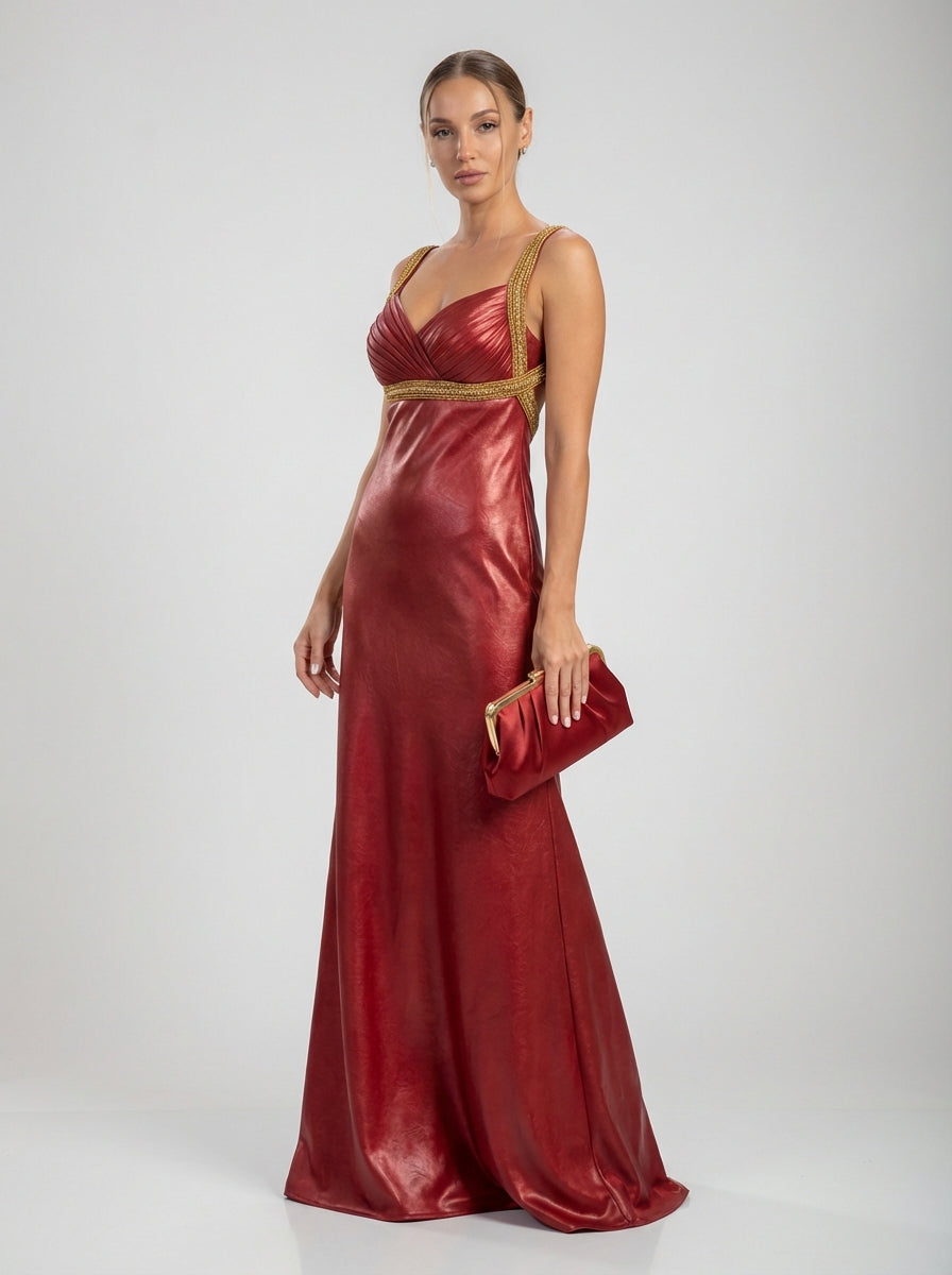 שמלת ערב סאטן מבד גארנט עם רצועות עם גימור זהב, חזה קפלים וגזרה חלקה באורך הרצפה.