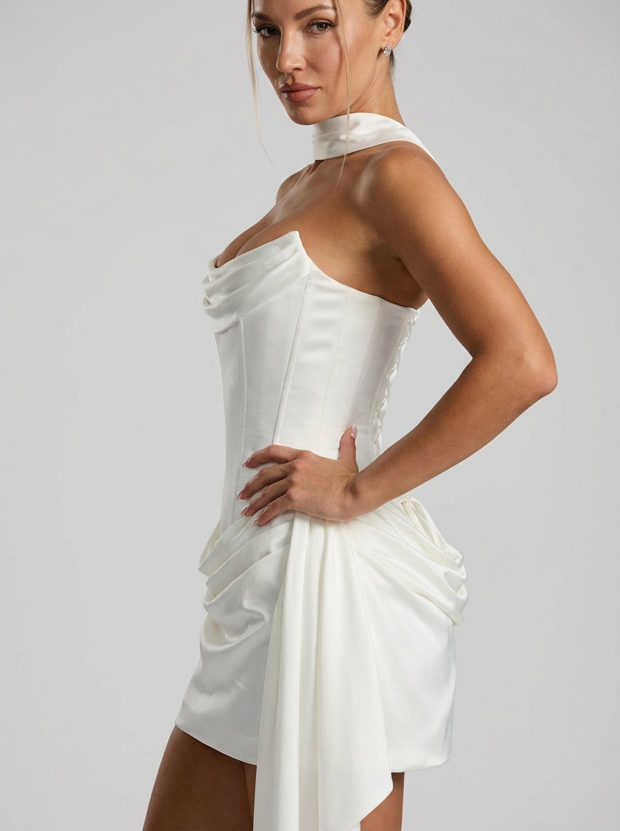 סלסט מיני היא שמלת מיני לבנה ללא כתפיות בגזרת מחוך עם פרטים דקים וגזרה מחויטת ללבוש כלה וערב מודרני.