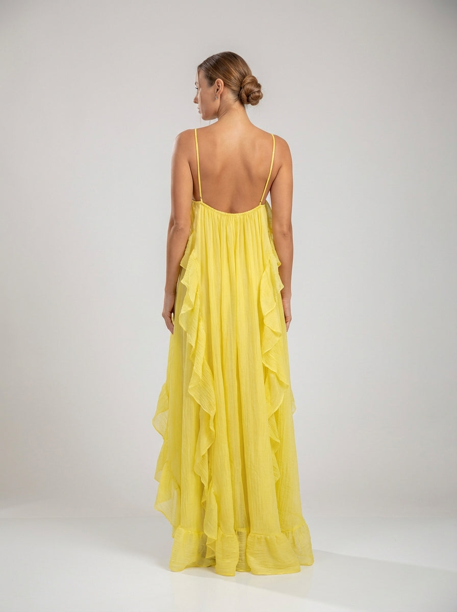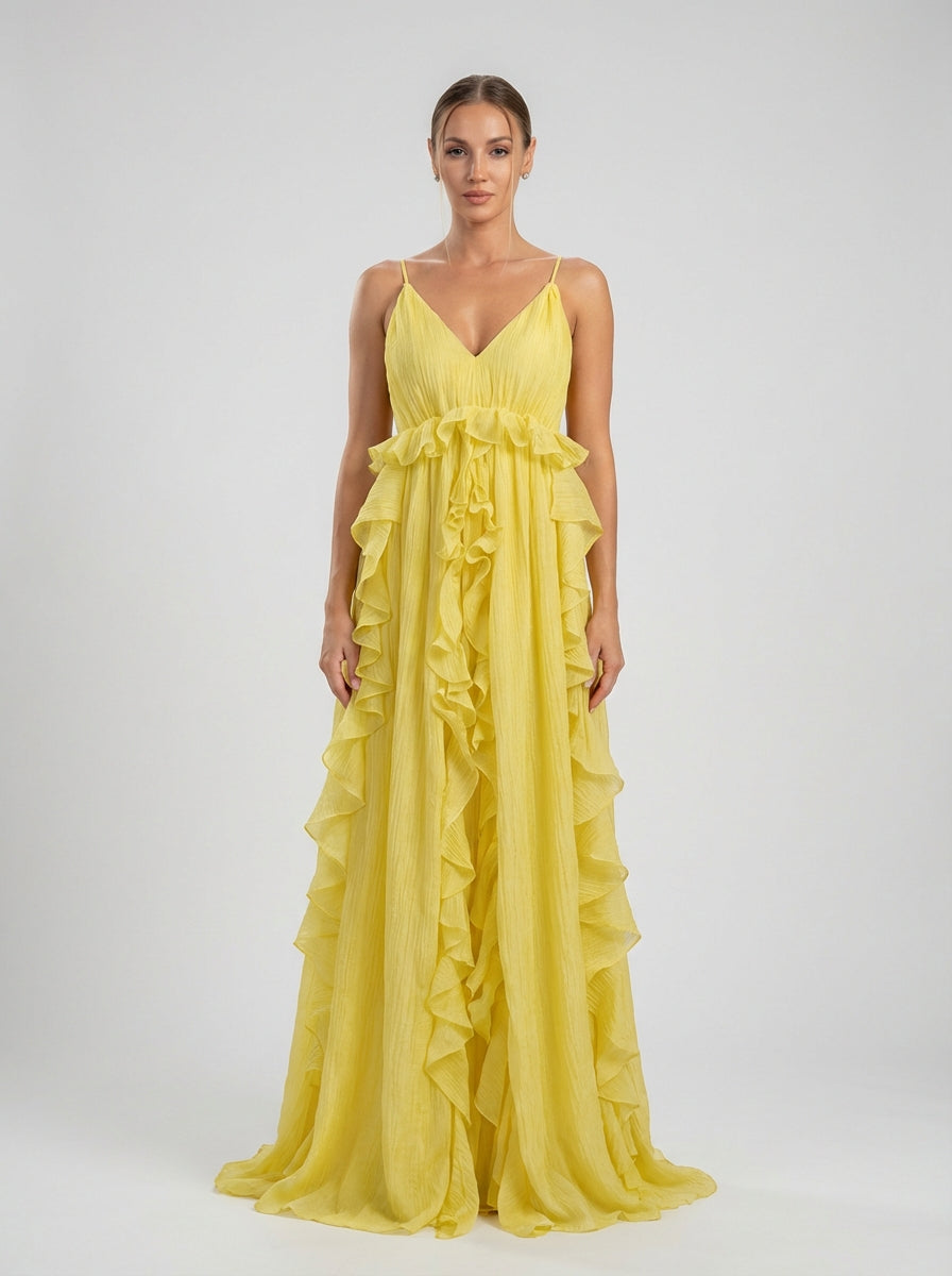 שמלת שיפון עם קפלים מדגם Soleil היא שמלה צהובה וזורמת באורך הרצפה עם רצועות עדינות, קפלים רכים וצללית אוורירית.